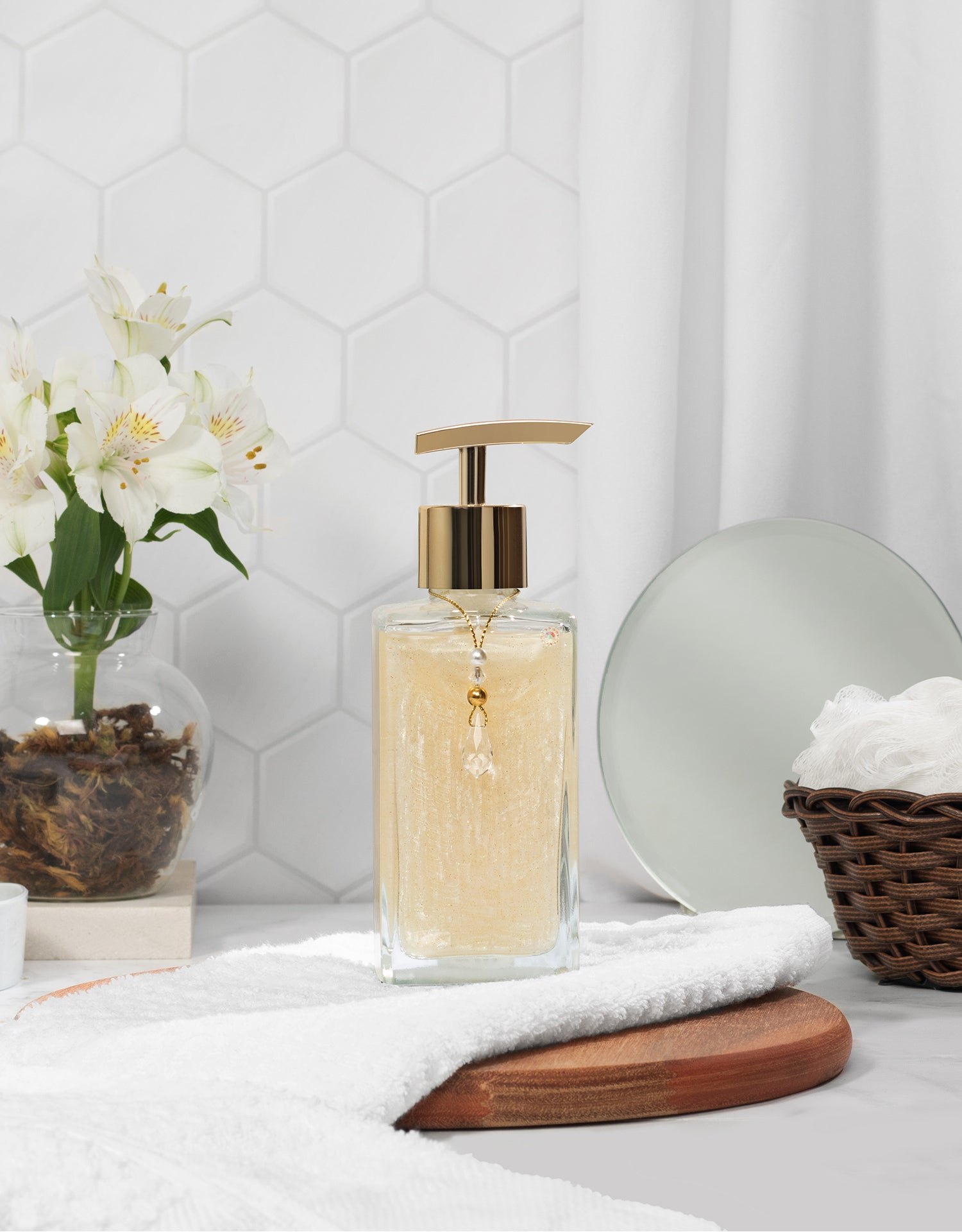 1 Frasco de vidro Square 250ml de Sabonete Líquido perolado com glitter e um cordão decorativo de cristal.