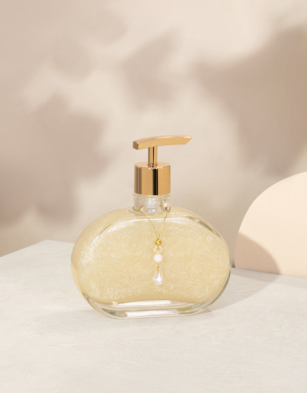 1 Frasco de vidro intense 300ml de Sabonete Líquido perolado com glitter e um cordão decorativo de cristal.